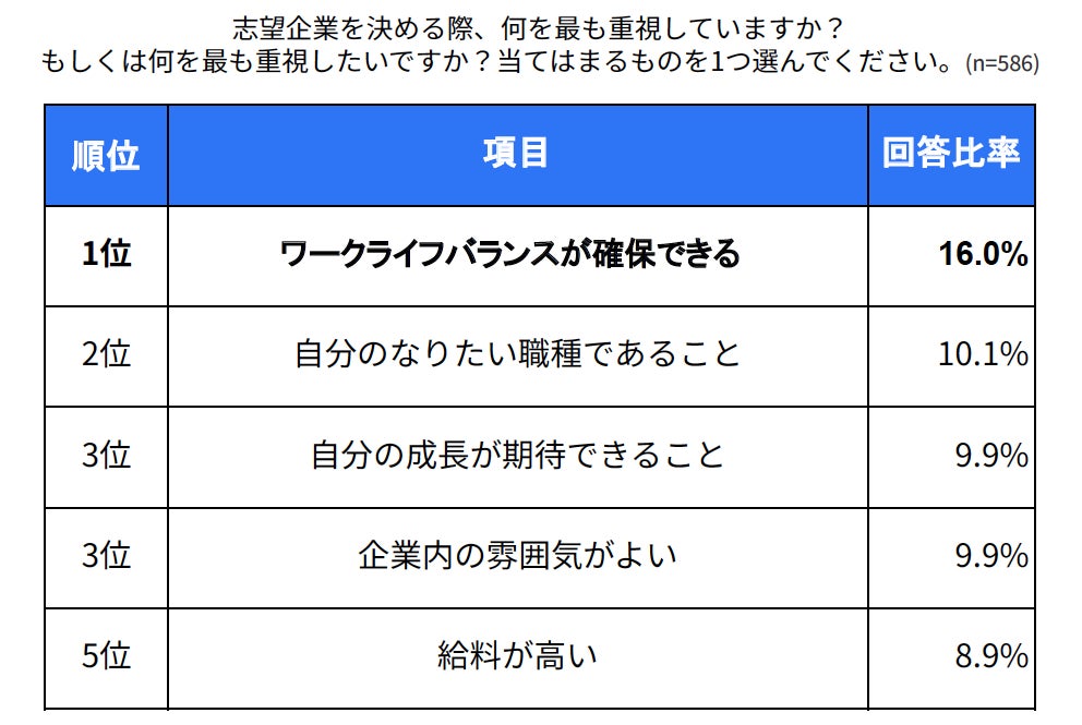 「志望企業を決める際に最も重視すること」に関する質問では、「ワークライフバランスが確保できる」が16.0%となり、「なりたい職種であること」(10.1%)、「自分の成長」(9.9%)、「企業内の雰囲気の良さ」(9.9%)を抜いて最多となりました。