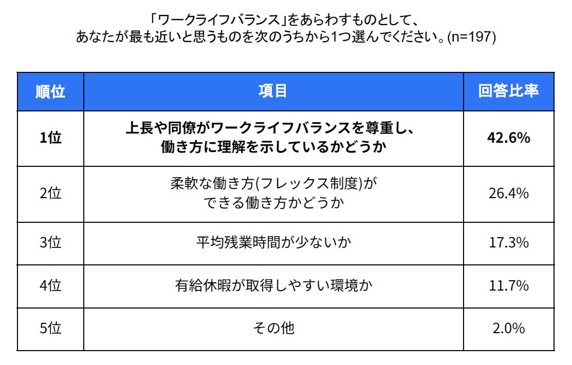 また、『「ワークライフバランス」を表すものとして最も近いものは?』という質問では、「上長・同僚がワークライフバランスを尊重し、働き方に理解を示しているかどうか」が最多の42.6%に上り、制度の充実よりも「実際のところ周囲の理解があるか」「カルチャーとして浸透しているか」を見極めたい学生の考えがうかがえる結果となりました。