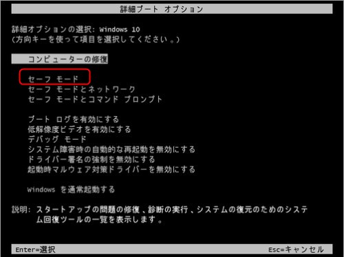ステップ2:「セーフモード」をマウスか矢印キーで選択し、「Enter」を押します。