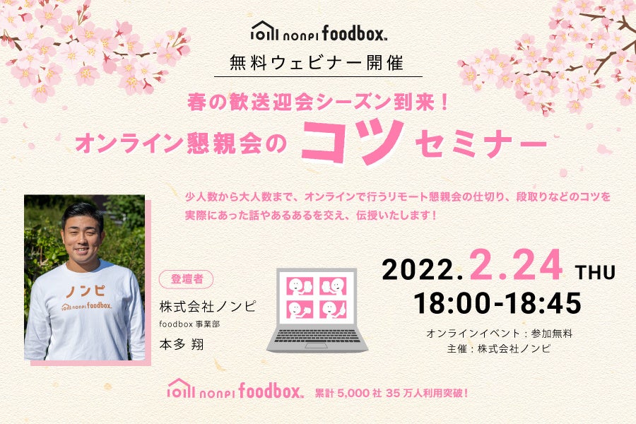 “日本全国に料理と飲み物を1箱にしたフードボックス”をお届けする『nonpi foodbox』を展開する株式会社ノンピ(本社:東京都港区、代表取締役社長 :柿沼寛之)は、2022年2月24日(木) に『春の歓送迎会応援オンライン懇親会の‟コツ”セミナー』を開催いたします。