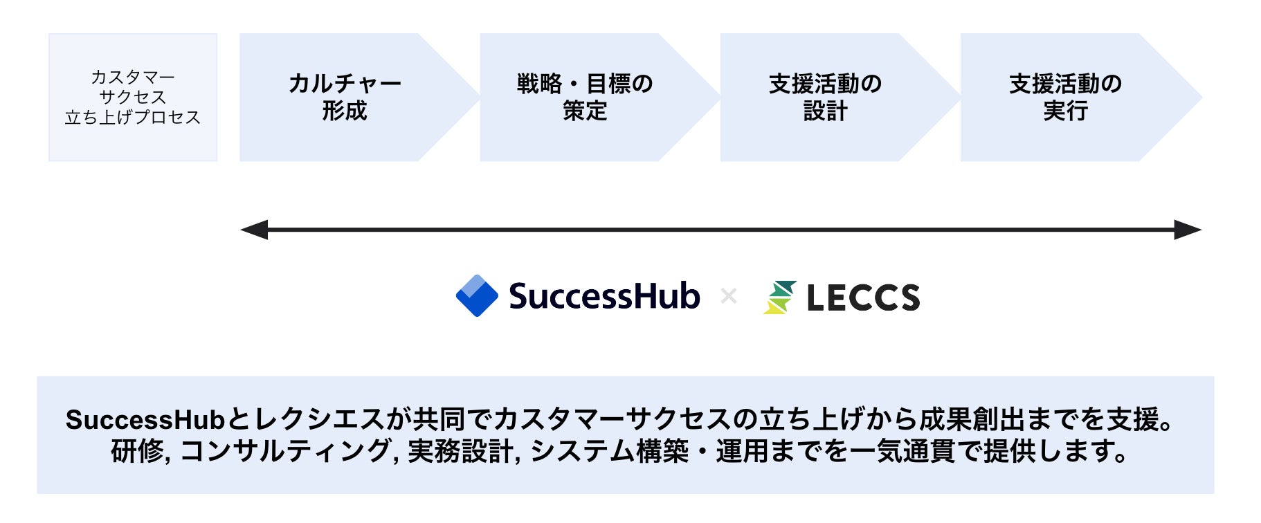 そこで、組織のカルチャー形成や戦略設計に強みを持つレクシエス社と、実務の設計から日々の業務オペレーションの実行支援に強みを持つSuccessHubが両社の知見とアセットを集約し、企業に対してカスタマーサクセスのノウハウをインストールします。これにより組織づくりから実際の事業インパクトを伴う成果の創出まで包括的な支援ができ、カスタマーサクセスの成功確率を最大限に高めることが可能となります。