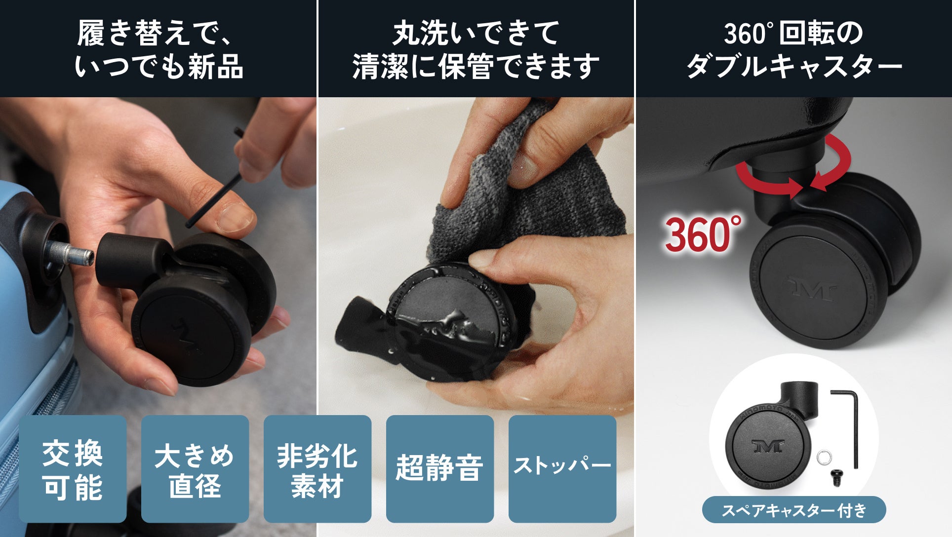 HINOMOTO製の直径55mmの大きめ静音キャスターを採用。ダブルホイール仕様で、走行がスムーズ。また、ストッパー機能付きで、立ったまま軽く踏むだけで簡単にブレーキをかけられます。さらに、付属の六角レンチを使えばキャスターの交換も簡単。キャスターが故障してもスーツケース全体を買い替える必要がありません。(意匠登録番号:1734959)