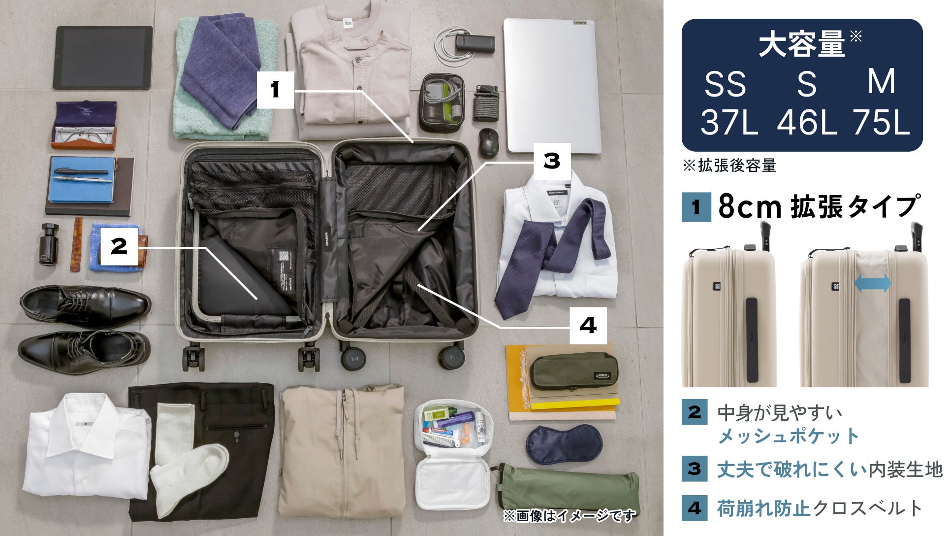 8cmの拡張機能を搭載し、収納容量が約30%アップ!これ1つで実質2つ分の収納力を実現します。帰りのお土産が増えても安心。手荷物を増やすことなく、すべてをすっきり収めることができます。