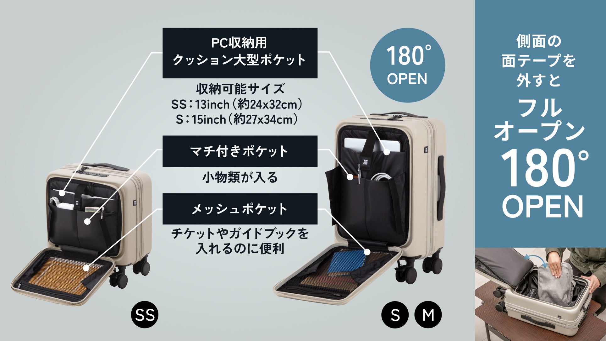 フロントオープンポケットを搭載したことで、スーツケースを立てたまま荷物の取り出し可能。マジックテープを外すと180°大きく開くフルオープン仕様になり、狭い場所でも快適にパッキングしていただけます。