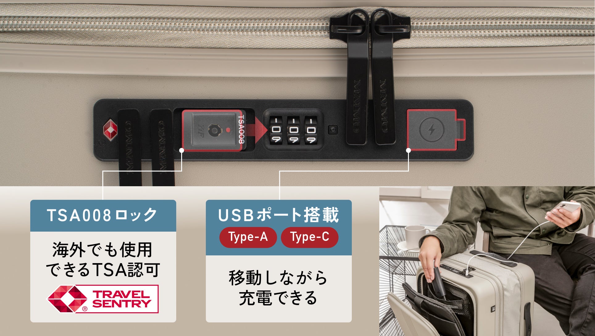 フロントポケットとメインポケットには、最新のセキュリティ機能であるTSA008モデルを採用。鍵不要のダイヤル式暗証番号タイプで、簡単かつ安心してご利用いただけます。