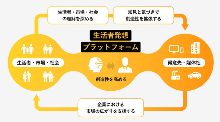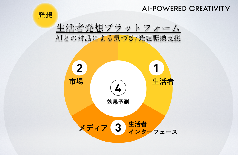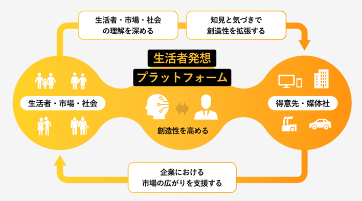 生活者・市場への深い理解や、新しい発見・価値創造をAIとともに行い、AI×生活者発想でビジネスの拡大を支援する、そのコアとなるのが「生活者発想プラットフォーム」です。AIという、自分とは違う存在を味方につけ、生活者の心を動かすアイデアを生み出し、創造性の拡張へつながる、新しい発想の基盤となります。