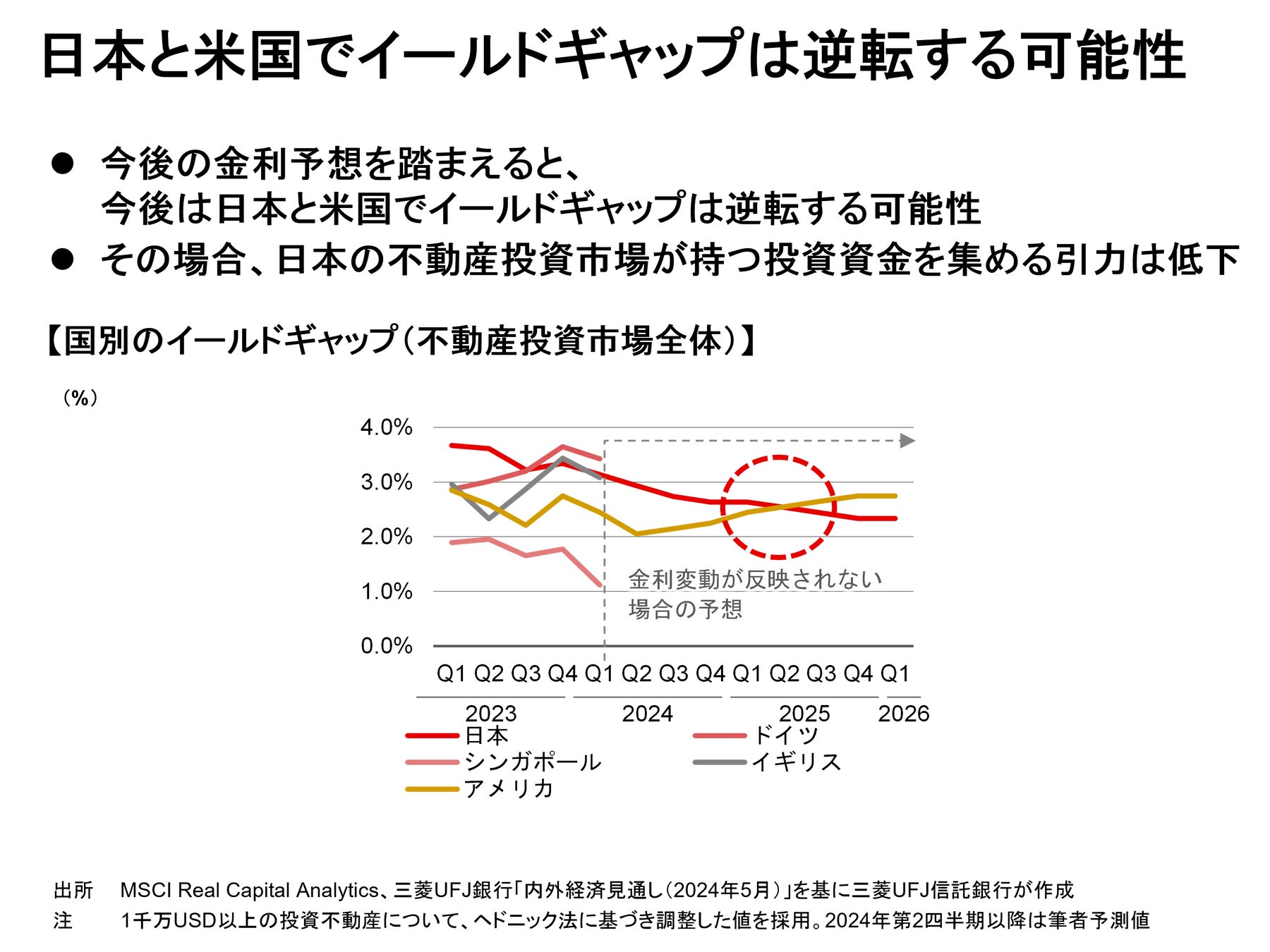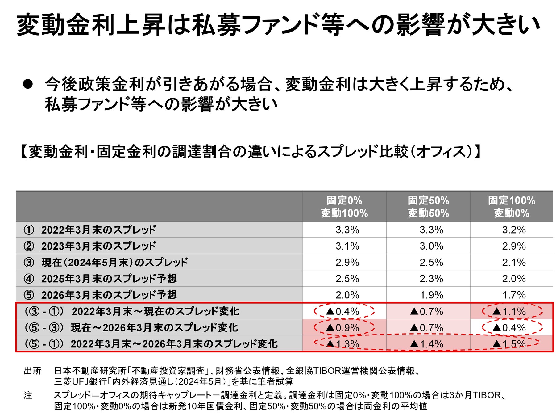 今後の金利上昇は、日本のイールドギャップを圧縮する。さらに変動金利の上昇によって私募ファンド等の金利コストを上昇させ、キャップレート上昇圧力となる。