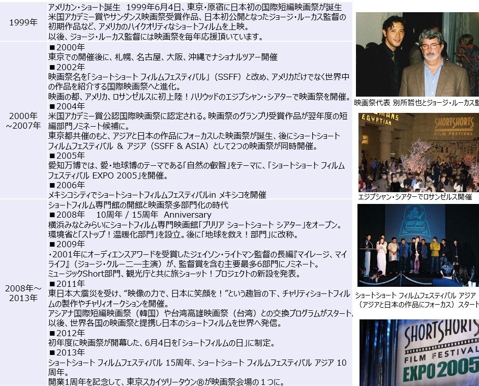 また同年、アジア発の新しい映像文化の発信・新進若手映像作家の育成を目的とし、同年に「ショートショート フィルムフェスティバル アジア(SSFF ASIA 共催:東京都)」が誕生し、現在は 「SSFF & ASIA」を総称として映画祭を開催しています。