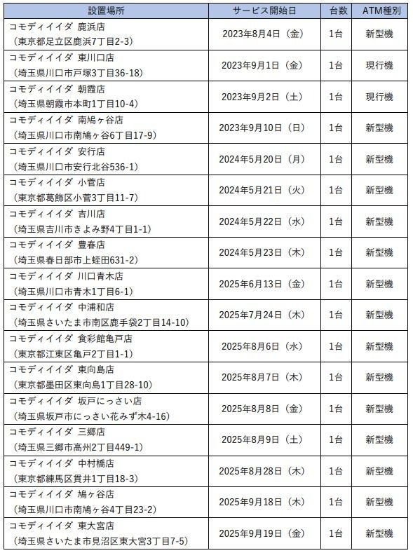 当行は、2025年9月19日(金)に株式会社コモディイイダ(東京都北区、代表取締役社長 飯田 武男、以下「コモディイイダ」)が運営するスーパーマーケット「コモディイイダ 東大宮店」にローソン銀行ATM新型機を1台設置いたしました。コモディイイダとは、2023年に同社の店舗へのATM設置について合意しており、2025年9月末までに17台のローソン銀行ATM(新型機15台、現行機2台)を設置完了いたしました。