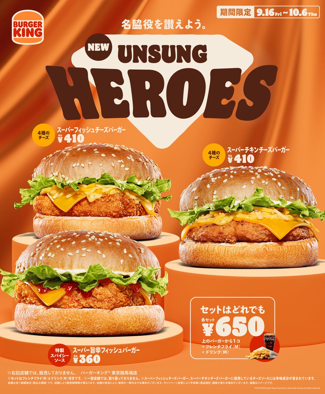 フィッシュバーガー、チキンバーガー好きの皆様も、いつもはバーガーキング® 自慢の直火焼きの100%ビーフパティをお召し上がりいただいている皆様も、特製旨辛スパイシーソース、4種のチーズで新しく生まれ変わった脇役バーガー「アンサングヒーローズ」、『スーパー旨辛フィッシュバーガー』『スーパーチキンチーズバーガー』『スーパーフィッシュチーズバーガー』の3商品を、ぜひこの機会にお楽しみください。