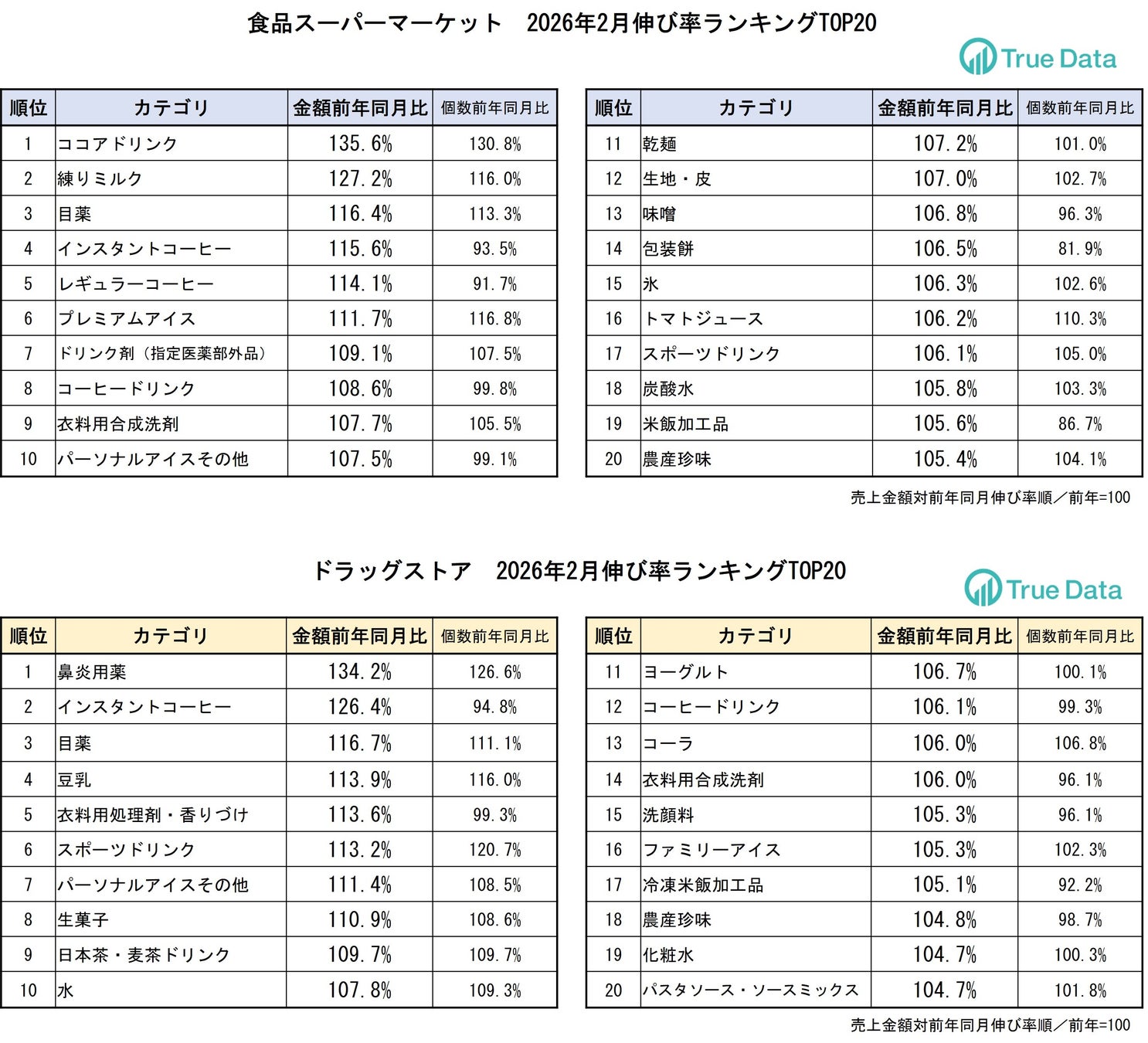データをもとに企業の意思決定を支援する株式会社True Data(トゥルーデータ/本社:東京都港区、代表取締役社長:米倉 裕之、証券コード4416)は、当社の統計データをもとに、ドラッグストア、食品スーパーマーケットにおける2026年2月の売り上げ伸長カテゴリを発表します。