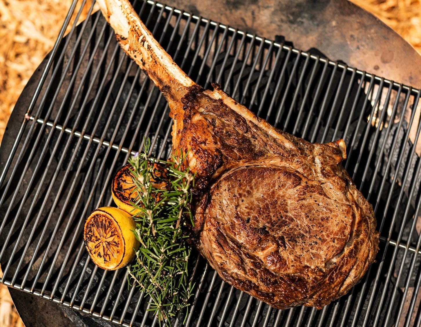 キャンプこそ豪快に、骨付きの牛肉「トマホーク」を直接焚火台に乗せてじっくりと焼ける迫力満点のセット。