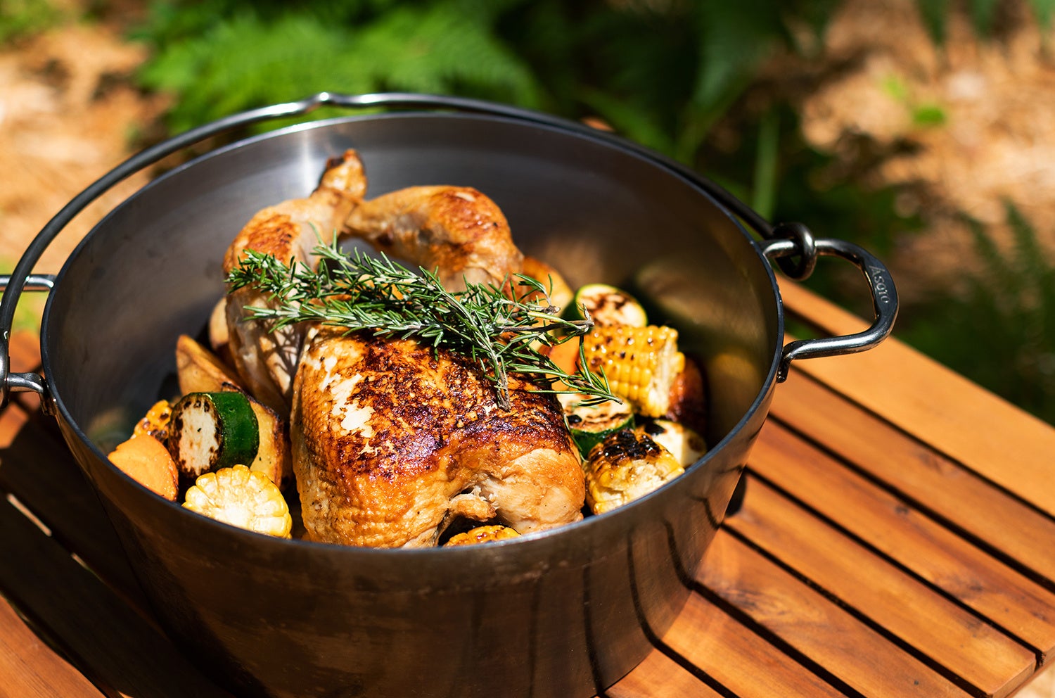 山梨県産地鶏を丸々1羽と季節の地元野菜を合わせたオーブン焼き。