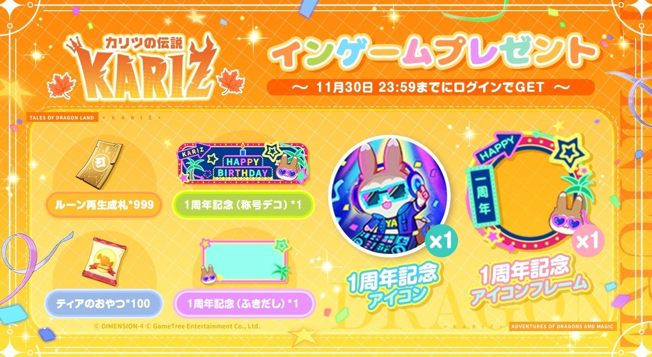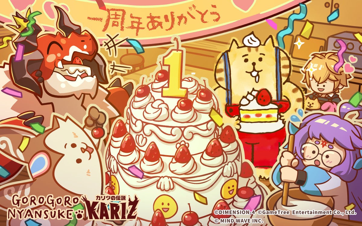 ZlongameとGameTreeは、竜と暮らす冒険RPG『KARIZ -カリツの伝説-』(以下:カリツの伝説、カリツ)が2024年11月8日(金)にアプリ配信開始から一周年を迎えることを記念し、狩竜士の皆様へ感謝の気持ちを込め11月6日(水)よりゲーム内・外でアニバーサリーイベントを開催するとともに、『ごろごろにゃんすけ』とのコラボレーションイベントを開始することをお知らせします。
