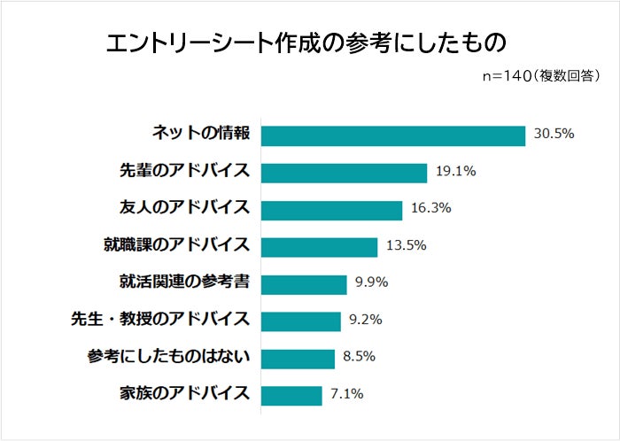 「エントリーシート作成の参考にしたもの」を聞いたところ、1位「ネットの情報(30.5 %)」でした。2位「先輩のアドバイス(19.1%)」、3位「友人のアドバイス(16.3%)」、4位「就職課のアドバイス(13.5%)」と続きます。