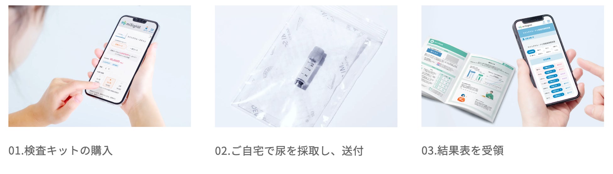 がんは長年に渡る生活の中でDNAにダメージが蓄積し、ある日突然発症する病気です。そのため、一度きりの検査で完結する「点」の発想ではなく、連続的な「線」で対策することが重要と考えます。「マイシグナル®︎シリーズ」は尿やだ液を提出するだけの簡便な検査を通じて、がん対策を継続的に行う「線」のアプローチを実現した革新的なサービスです。4つの検査を通じて、自らの体質的なリスクを知り、日々のDNAのダメージをモニタリングすることで発症の予防につなげ、それでも防ぎきれないがんの早期発見をサポートします。誰もが気軽に検査を受け、がんの予防と早期発見を促進することを目指しています。