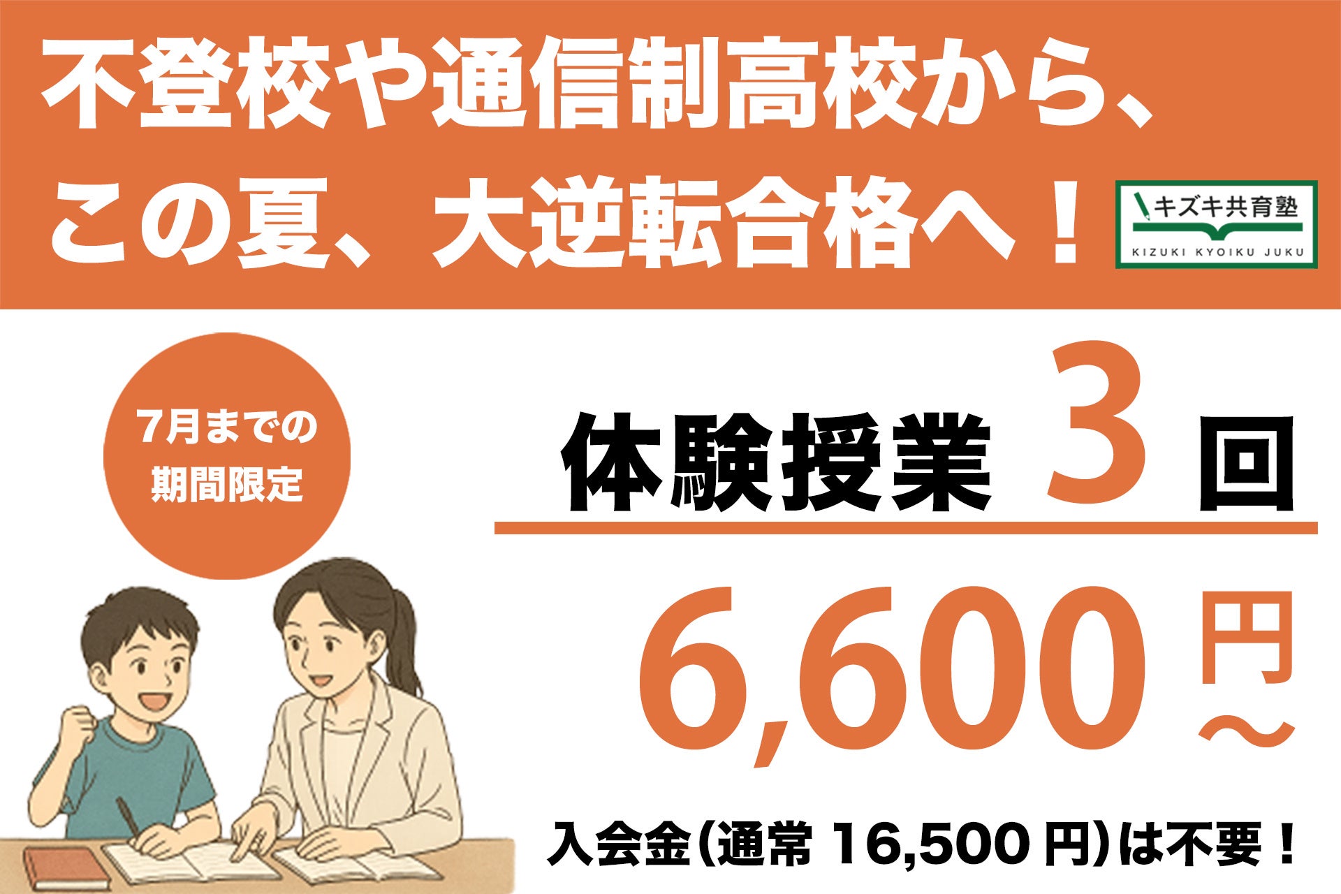 「不登校などの方々の学び直し・大逆転合格」を完全個別指導でサポートするキズキ共育塾(運営:株式会社キズキ)は、2025年7月末までの期間限定で、入会金無料・3回の体験授業が受けられる「夏の体験授業キャンペーン2025」を実施します。