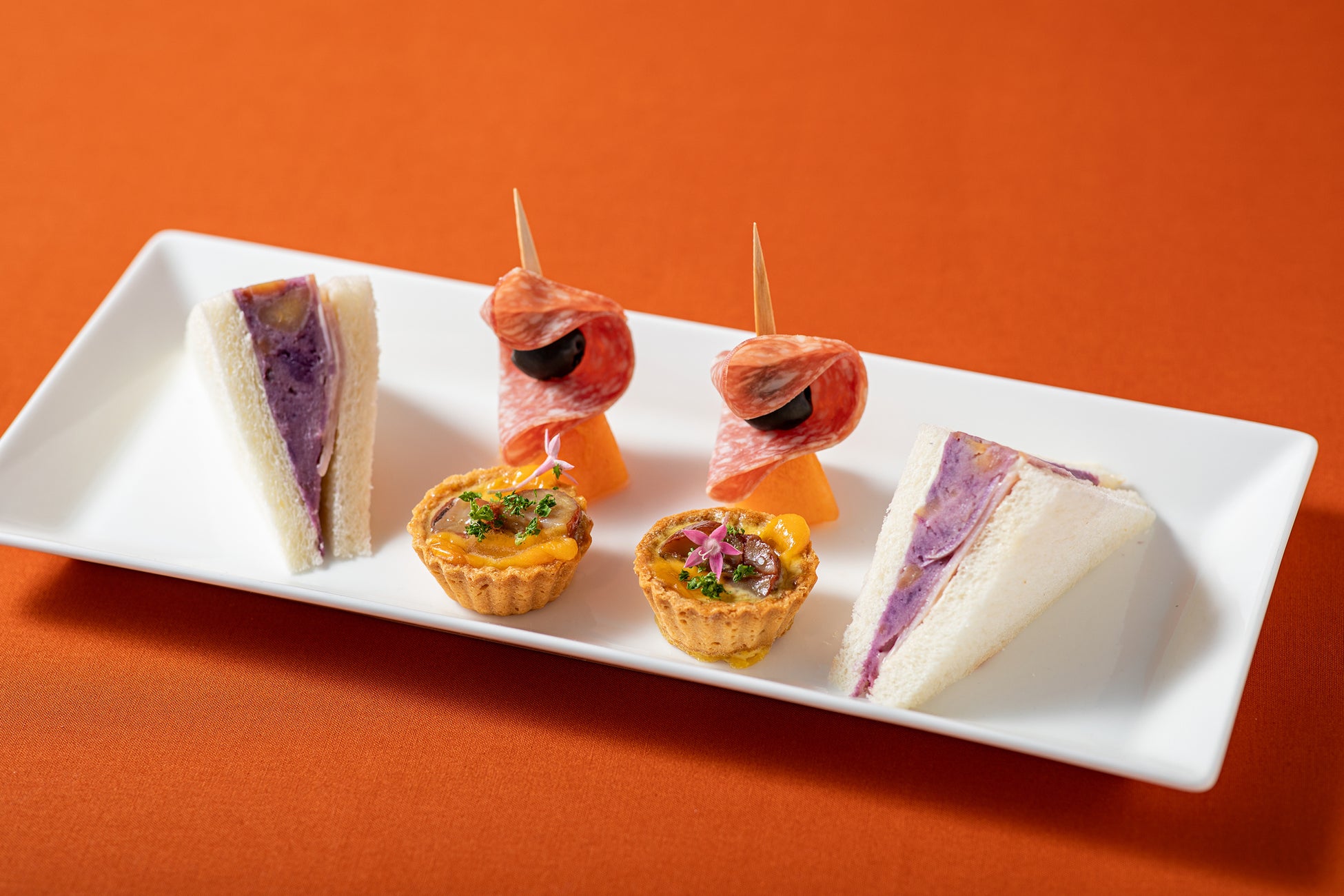 中段にはお酒との相性が良い、赤玉ねぎとハムを加えた紫芋のサンドウイッチ、栗とチェダーチーズのタルト、柿のピンチョス、3種のセイボリーをご用意。