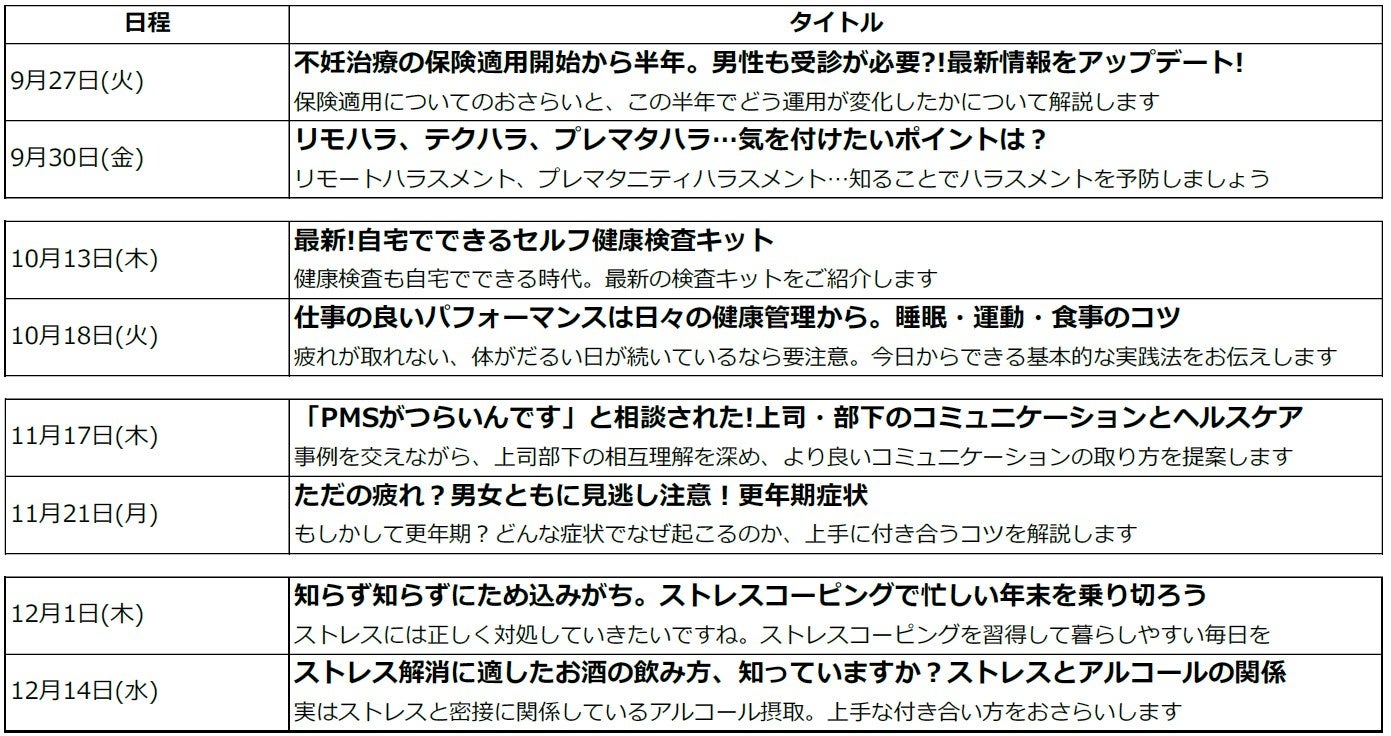 「オンラインまるのうち保健室supported by famione」は、オンライン妊活相談サービス「ファミワン※3」との共創プログラムとして展開します。オンラインセミナーでは、女性の健康課題全般・パートナーシップ及びスキルアップについての基礎知識を性別・年代を問わず相互理解を促す全28回のセミナーを公開します。さらに、ヘルスケアや対人関係の悩みを気軽に相談でき男女問わず参加可能な「オンライン保健室(カウンセリング)」も実施します。すべて無料でご参加いただくことができ、ご興味のあるコンテンツをご自由に選択・ご参加いただけます。
