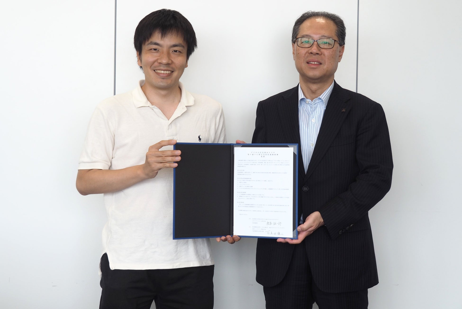日本最大級のNFTマーケット「HEXA(ヘキサ)」を運営するメディアエクイティ株式会社(代表取締役:椛島 誠一郎、写真左)は、東武トップツアーズ株式会社(社長執行役員:百木田康二、写真右)と包括的業務提携を行いました。