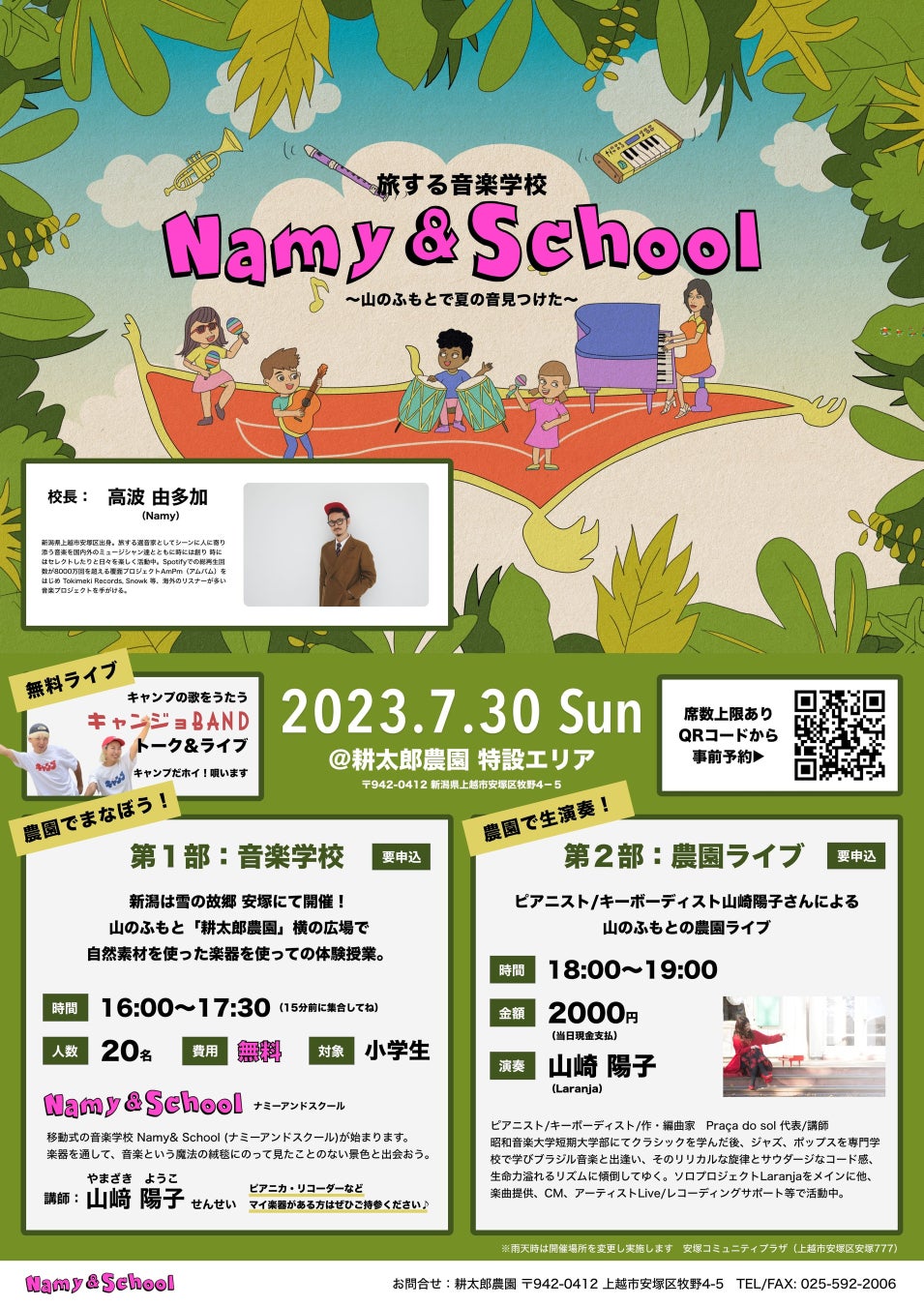 7月30日(日)耕太郎農園(新潟県上越市)で開催される「Namy&School〜山のふもとで夏の音見つけた〜」にライブ出演します。