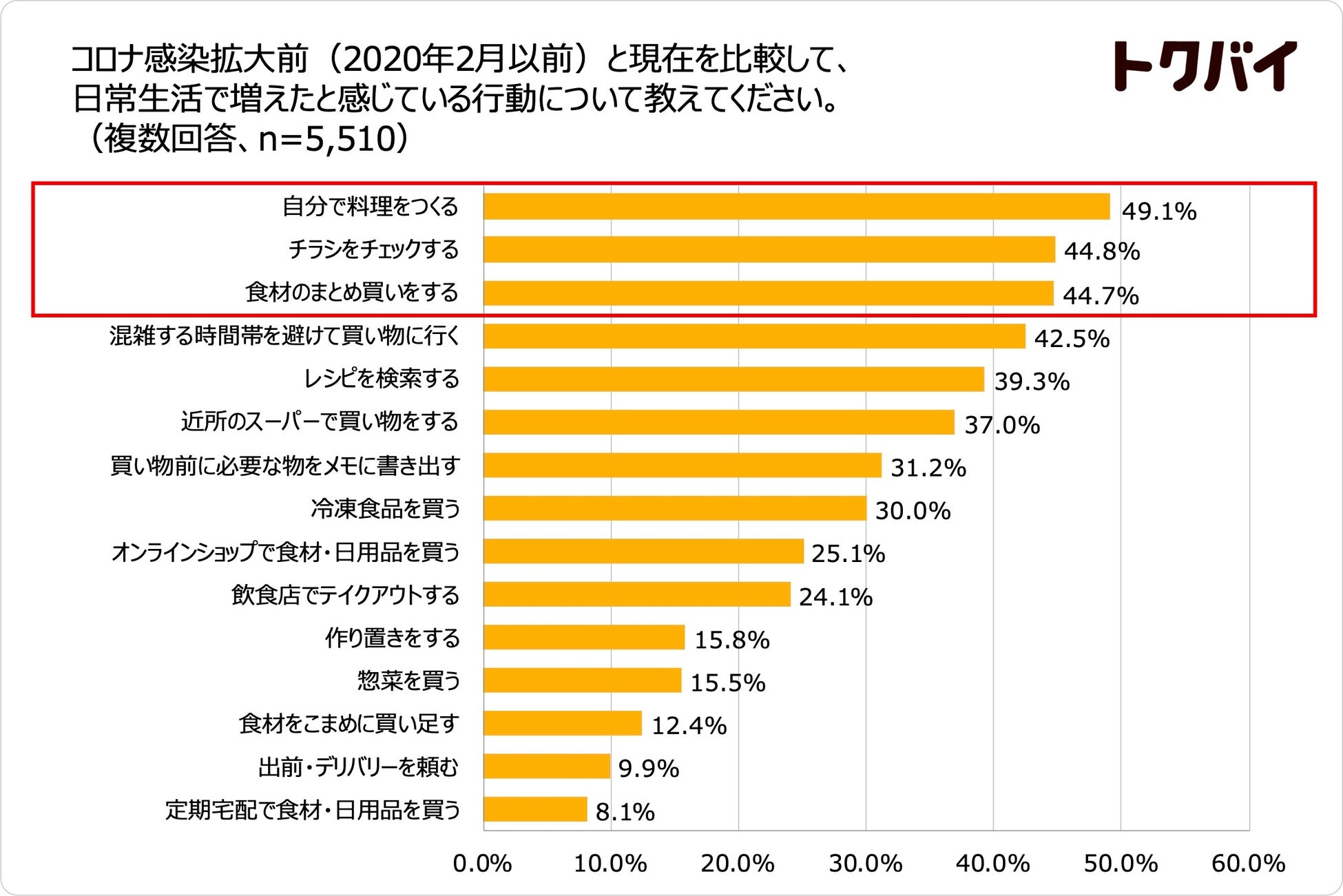 コロナ感染拡大前と比較して「増えた」と感じる行動について尋ねたところ、「自分で料理をつくる」との回答が49.1%、次いで「チラシをチェックする」が44.8%、「食材のまとめ買いをする」が44.7%となりました。