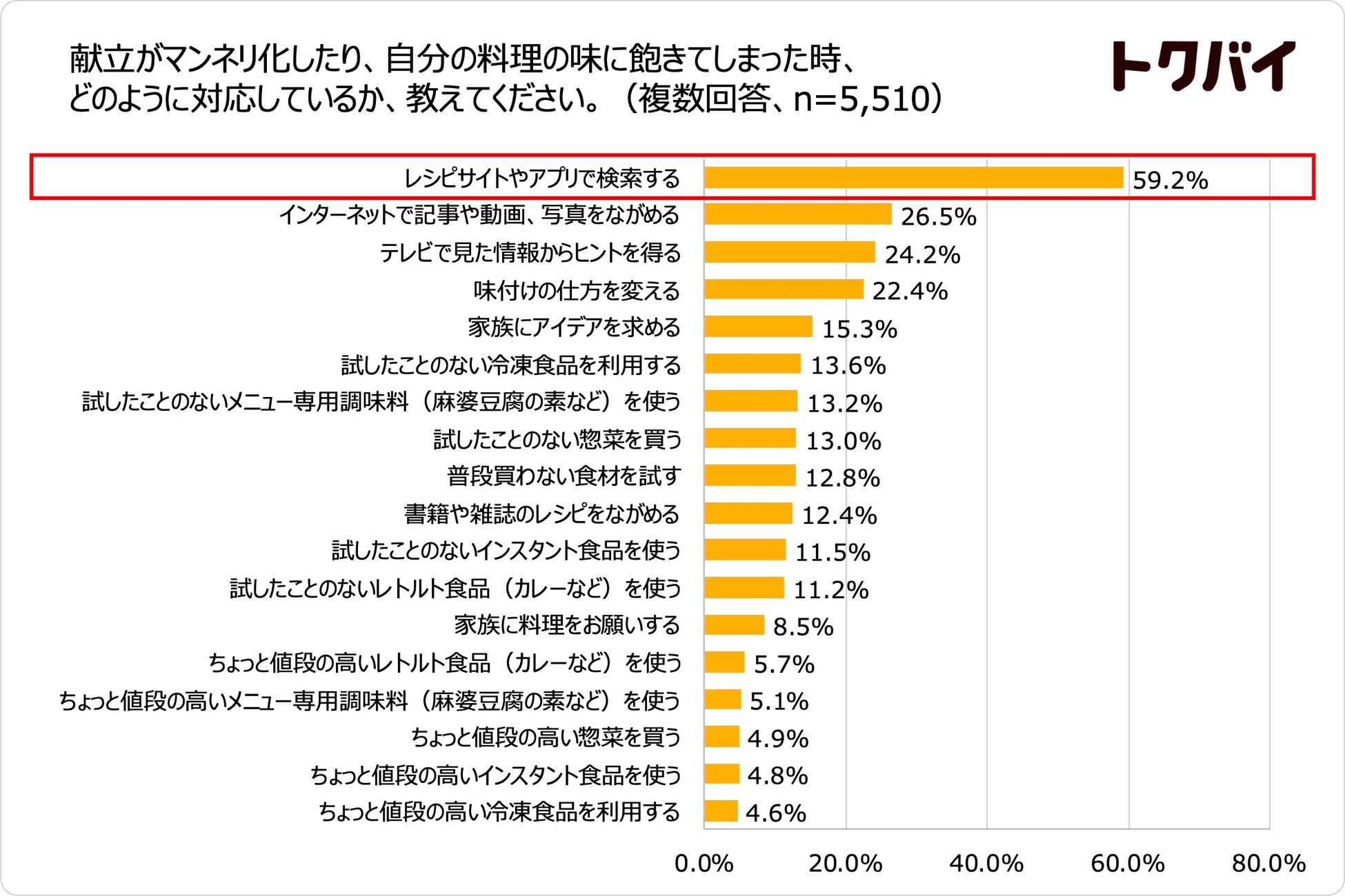 献立がマンネリ化したり、自分の料理の味に飽きてしまった時の行動について尋ねたところ、「レシピサイトやアプリで検索する」との回答が59.2%で最多となり、レシピコンテンツに対するニーズの高さが浮き彫りとなりました。