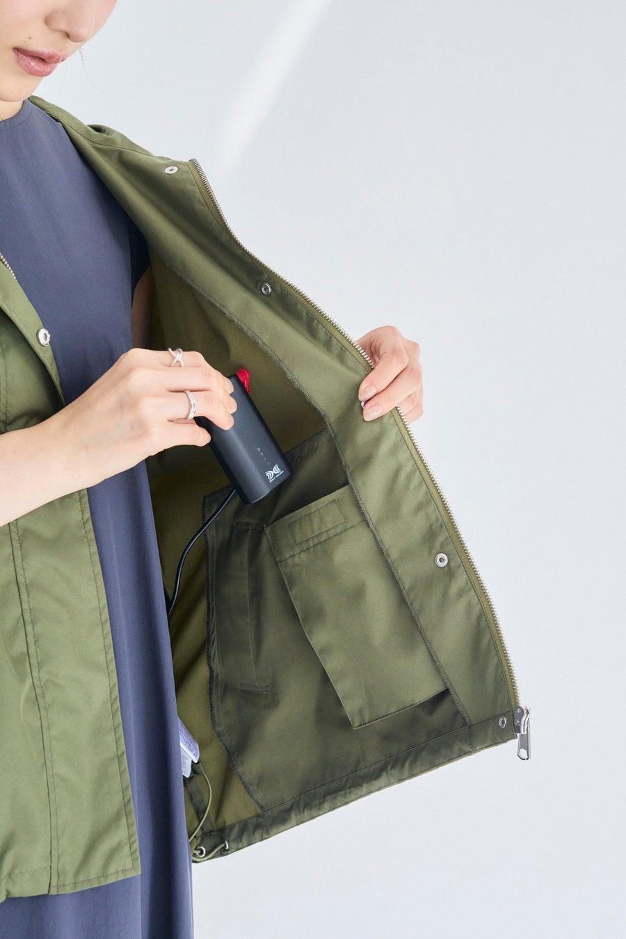 ファン付きウエアのパイオニアである、株式会社空調服との初コラボレーションアイテムです。ファン付きウエアの着心地や音に対する抵抗を払拭するため、軽量さと音の静かさにこだわり設計しました。ファンの風量は1~5段階まで調整可能なほか、ウエストを絞ることで風を逃さず、涼しい状態を長時間保つことができます。また、撥水加工とUV99%以上カットの機能を施すことで、涼しさだけでなく快適さを追求しました。猛暑と異常気象が予想される、今年の夏に欠かせない1枚です。