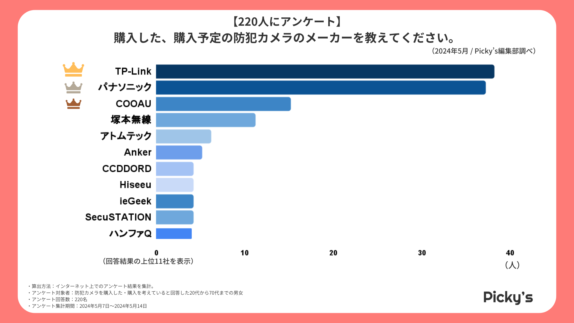 1位は高画質、ナイトビジョン搭載など機能性に優れた「TP-Link」、2位は安心の国内メーカー「パナソニック」、3位はシンプルでおしゃれな見た目がインテリアにもほどよく溶け込む「COOAU」、4位は多機能かつお手頃価格が魅力の「塚本無線」という結果になりました。