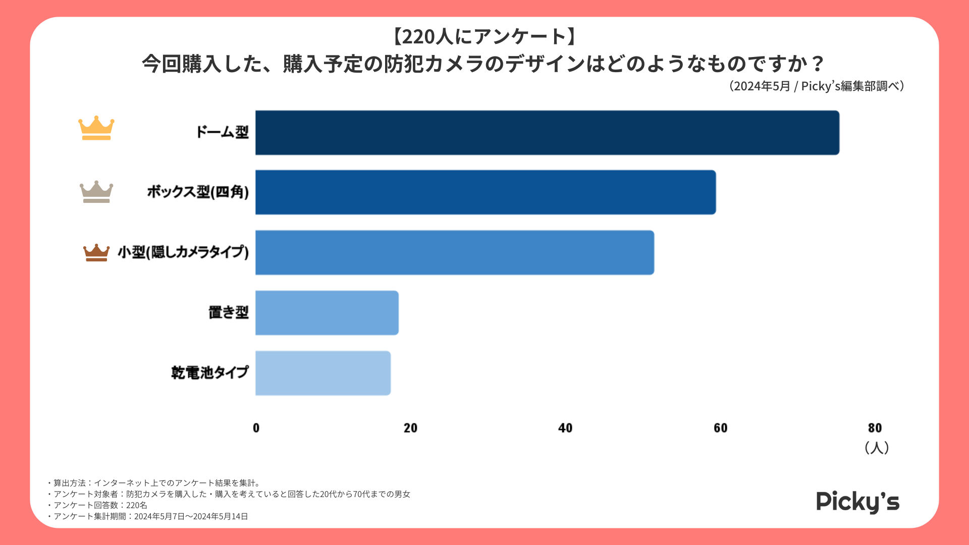 1位は360°近くの広角で幅広い視野での撮影が可能な「ドーム型」、2位は離れた距離までしっかり監視できる「ボックス型(四角)」、3位はバッテリーが弱いものの相手に悟られにくい「小型(隠しカメラタイプ)」という結果になりました。