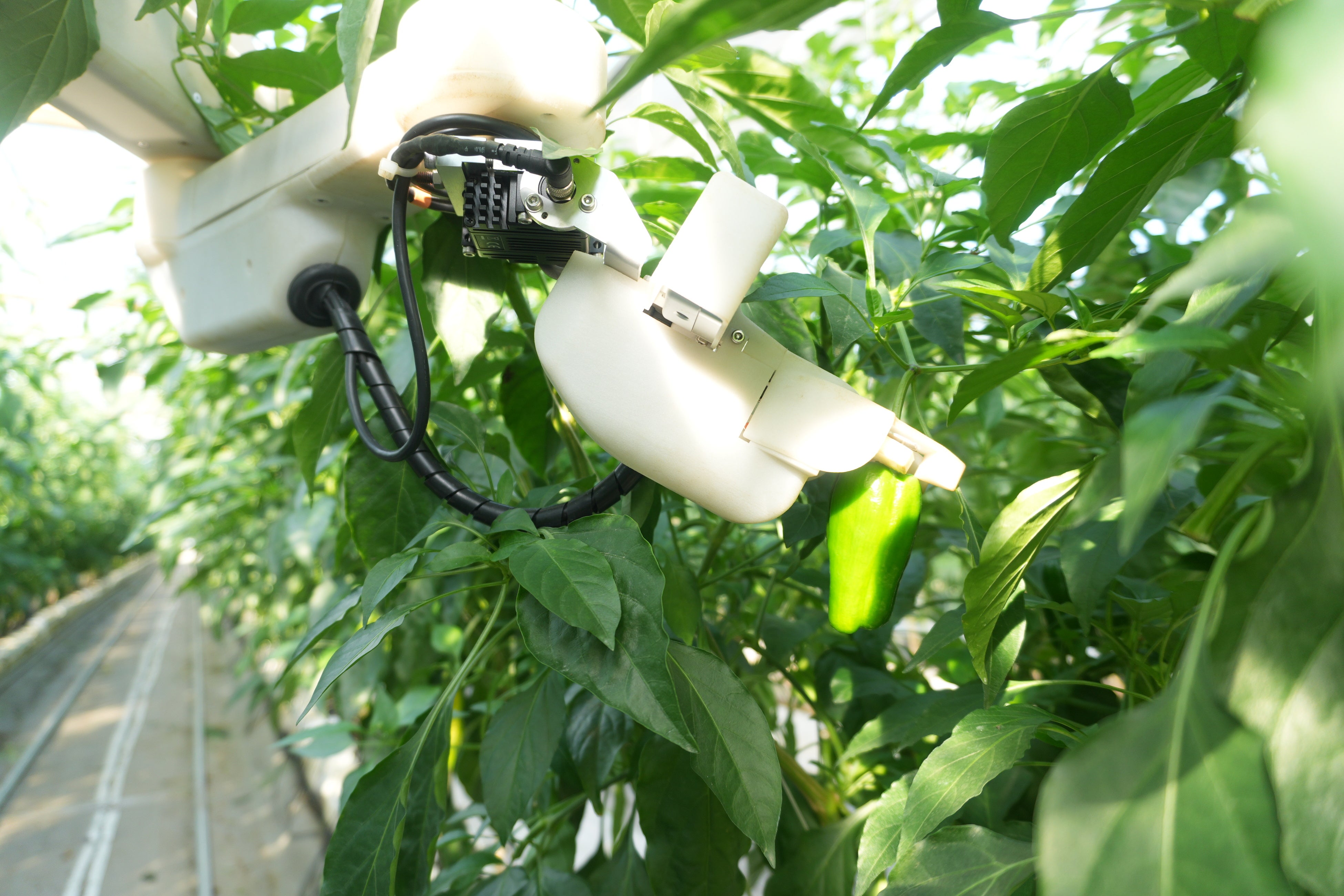 AGRISTの自動収穫ロボットQは、畝間に敷かれたレールの上を移動します。独自開発した収穫ハンドには、誤収穫防止センサーとカメラを搭載し、AIが収穫適期(大きさ)の作物を判断し収穫をします。