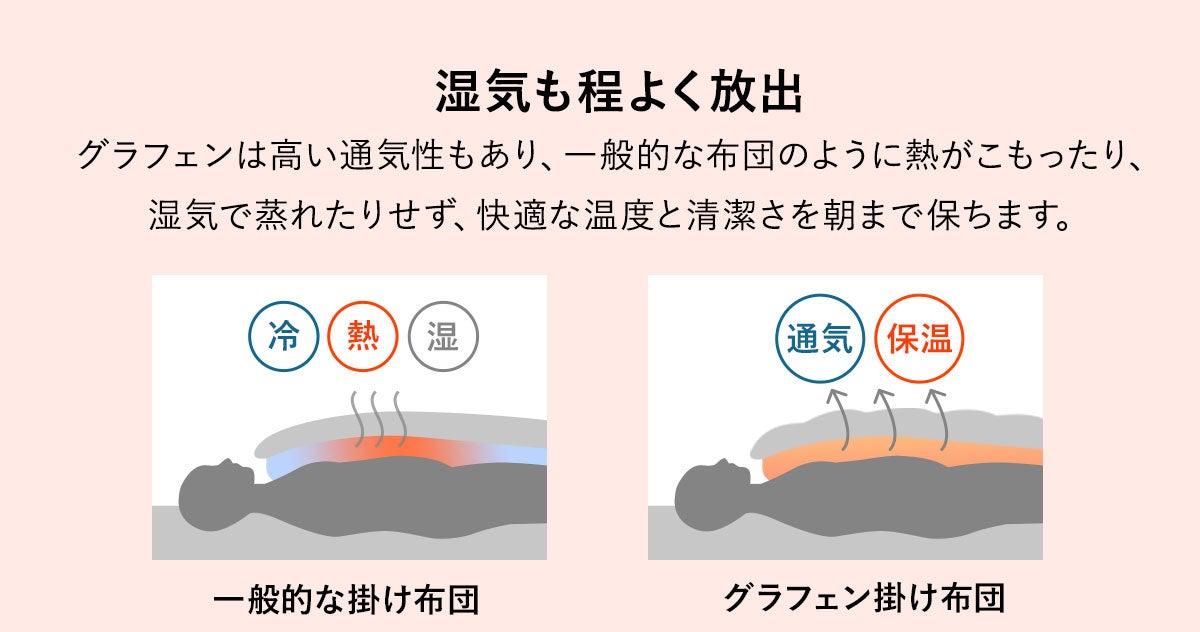 布団に入った瞬間からスピード発熱。熱伝導率の高い炭素繊維「グラフェン」を配合した高機能掛け布団が新発売!寒い季節にぴったりの次世代の掛け布団です。