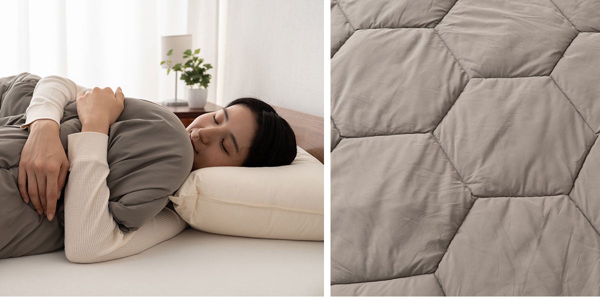 六角形のキルティング構造(ヘキサゴンキルティング)が中わたの偏りを防ぎ、どこに触れても均一な