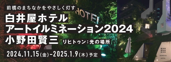群馬県前橋市のアートデスティネーション「白井屋ホテル」を運営する白井屋ホテル株式会社(群馬県前橋市本町、総支配人:堀口大樹)は、クリスマスに恒例のアートイルミネーションと美食を心ゆくまで楽しんでいただく特別なプログラムをご用意しました。今年のアートイルミネーションをてがけるのは、地元前橋出身のアーティスト、小野田賢三氏。白井屋ホテルの客室やエレベーターにも作品が展示されている小野田氏が『リヒトゥン:光の場所』というテーマのもと、白井屋ホテルの緑の丘をやさしく照らします。
