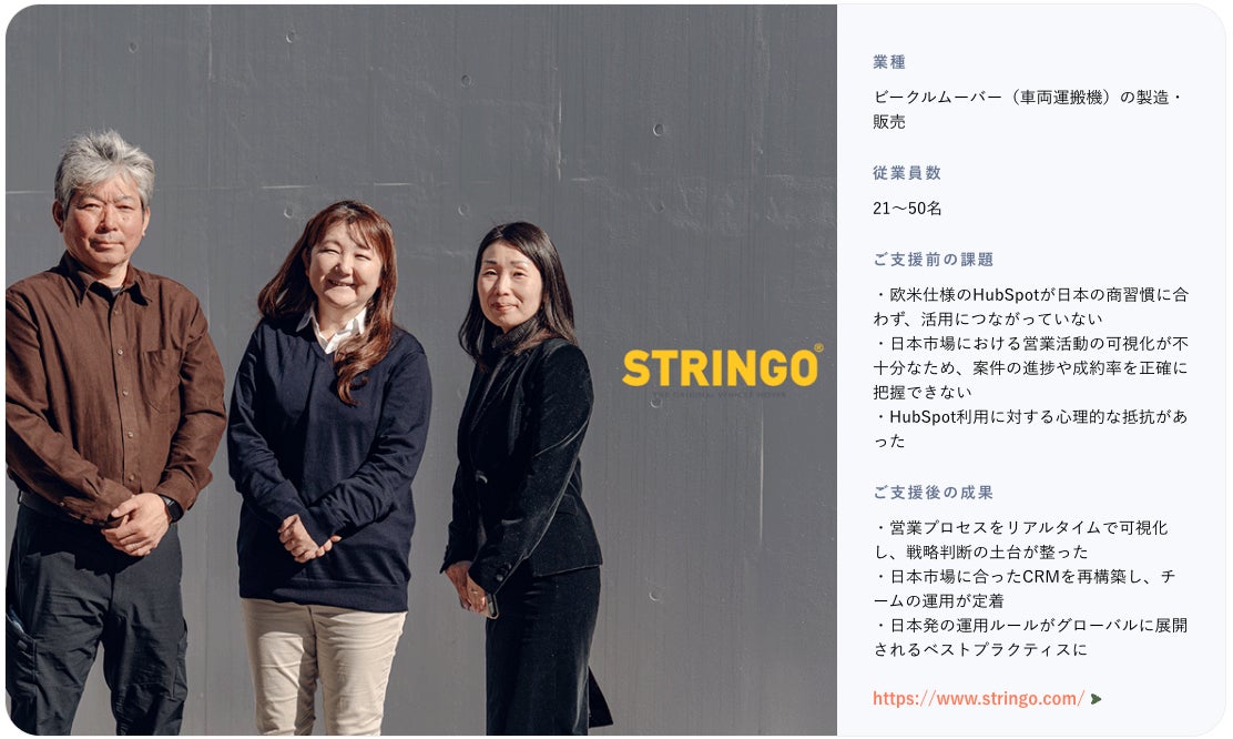ストリンゴ株式会社は、車両を安全かつ効率的に移動させる専用機器「ビークルムーバー」の開発・販売を行うグローバル企業です。グローバル本社の方針により、営業活動と商談情報の一元管理を目的としてHubSpotを導入していました。しかし、日本法人では以下のような運用上のギャップが明らかになりました。