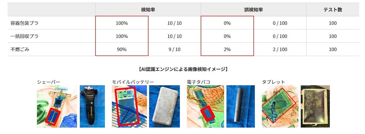 (プラごみ:検知率 100% 誤検知率 0%、不燃ごみ:検知率 90% 誤検知率 2%)
