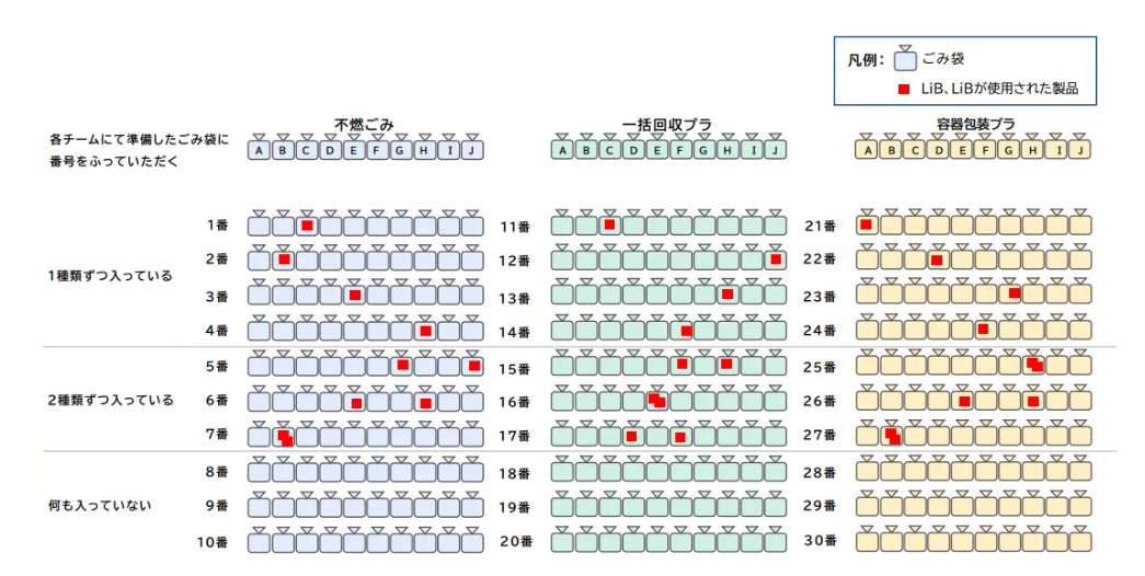 各チーム参加者に見えない状況で事務局がごみにリチウムイオン電池、リチウムイオン電池が使用された製品を混入する。
