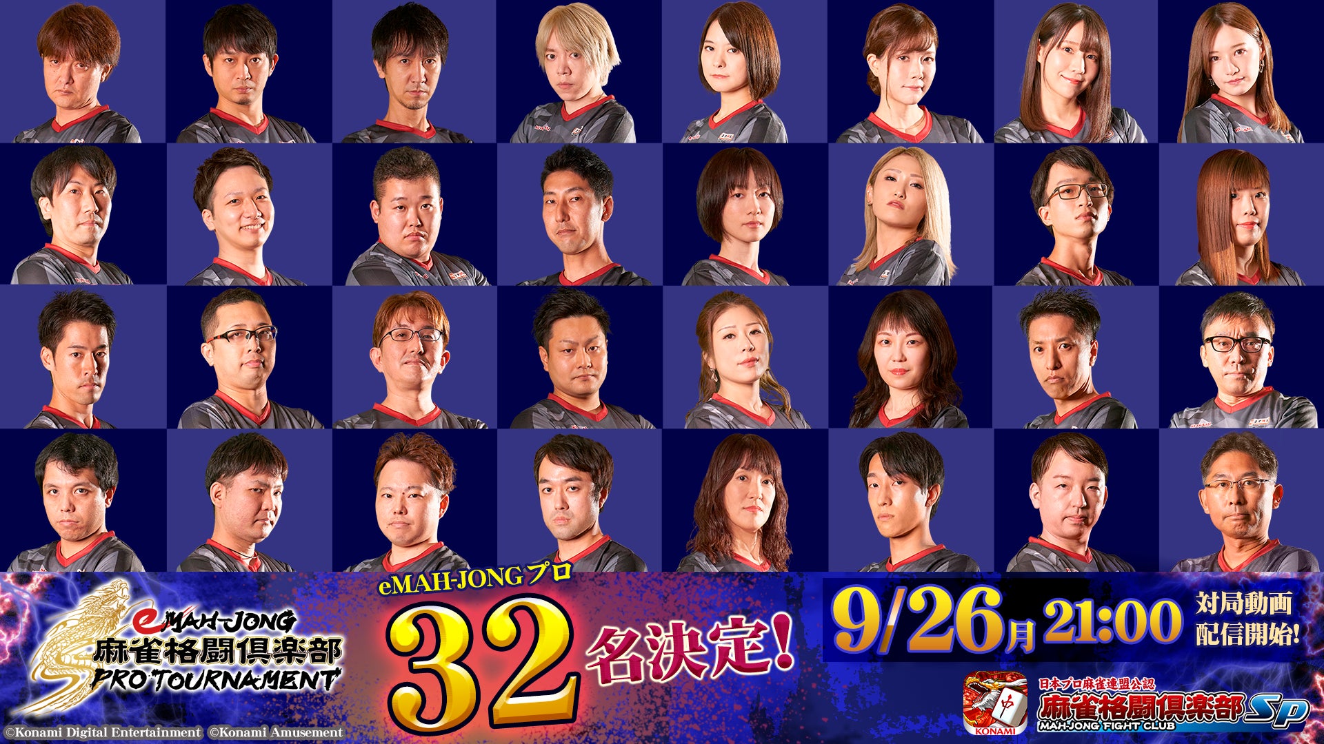 KONAMIと日本プロ麻雀連盟が行う一般選考とワンチャンス選考を経て選ばれた24名と、日本プロ麻雀連盟所属プロ雀士8名を合わせた32名の「eMAH-JONGプロ」が決定しました。『eMAH-JONG 麻雀格闘倶楽部 プロトーナメント』では、KONAMIと日本プロ麻雀連盟が行う選手選考に合格したプレーヤーを、日本プロ麻雀連盟が期間限定でeMAH-JONGプロとして認定しました。