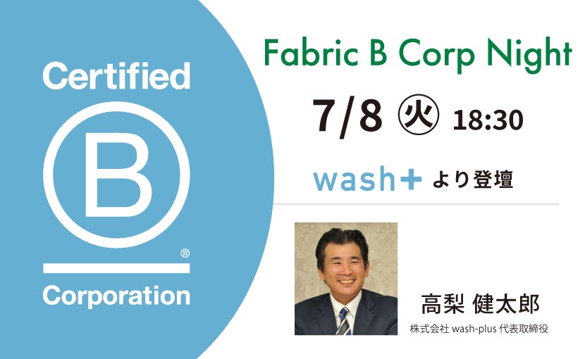 株式会社wash-plus(本社:千葉県浦安市、代表取締役:高梨健太郎)の高梨代表が、ファブリック株式会社(本社:東京都目黒区、代表取締役:James Hollow)主催の交流会「Fabric B Corp Night」7月8日開催分に登壇します。