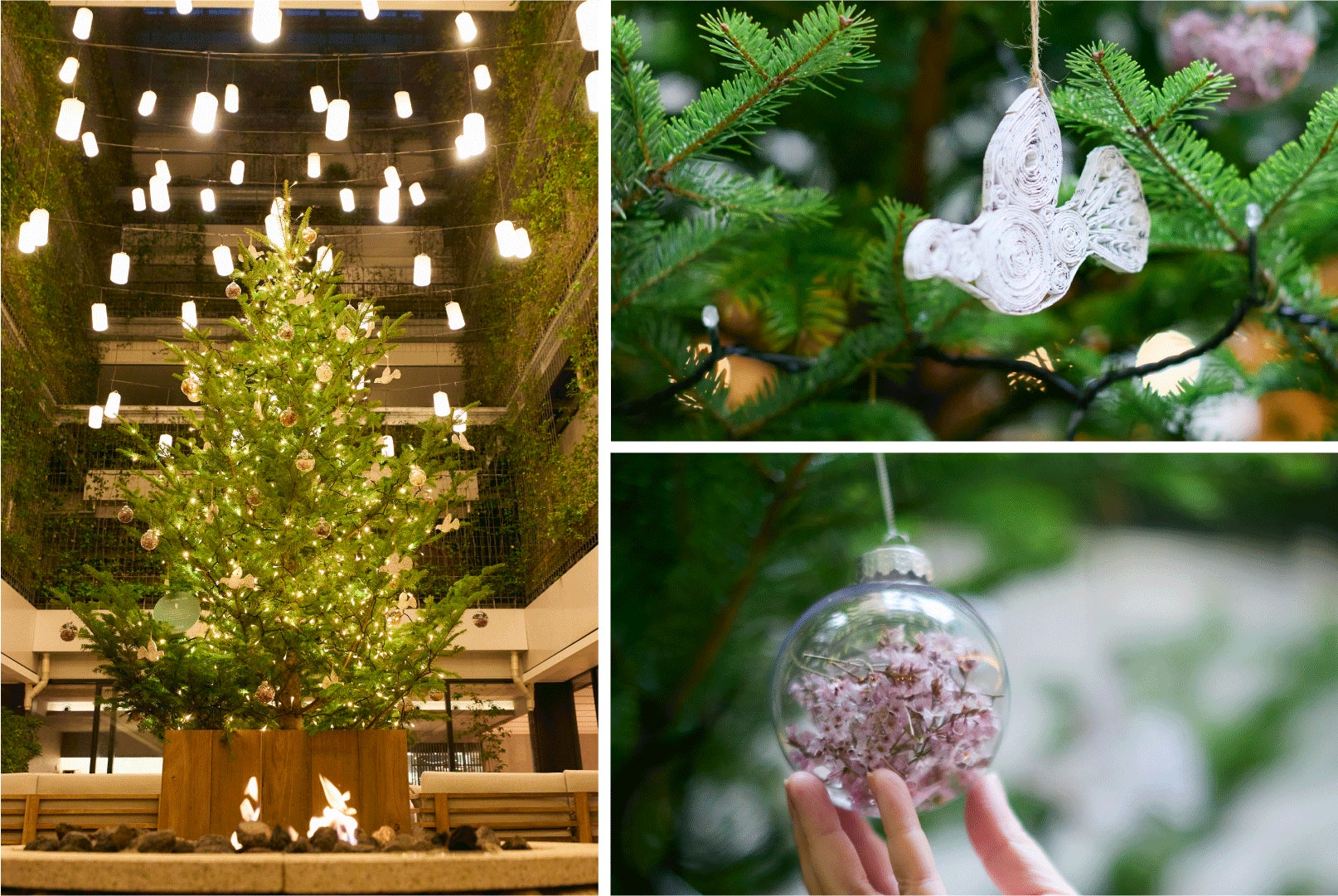 中庭のツリーは生のモミの木をベースに設置し、リサイクルペーパーや、これまで施設の装飾に使用したドライフラワーを活用したオーナメントで装飾。