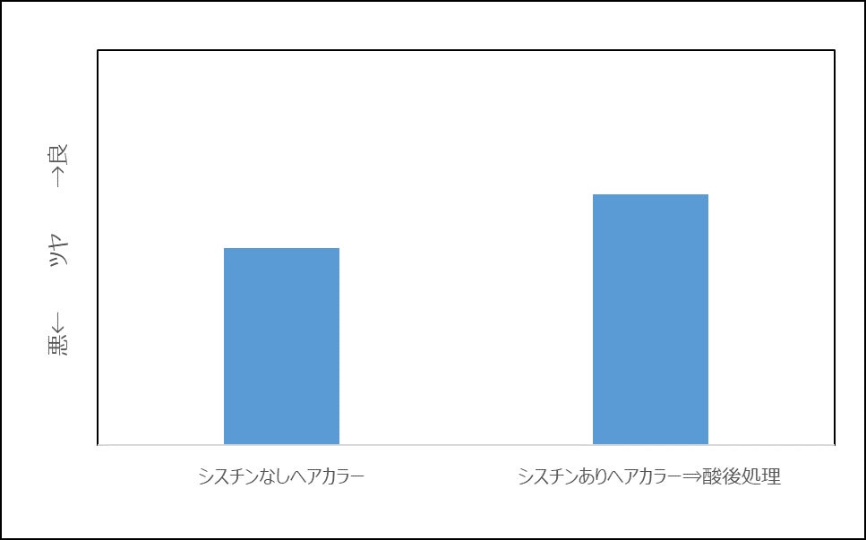 また、シスチンはアルカリ条件下では水に溶解し、中~酸性条件下では溶解しない性質をもっています。この性質から、ヘアカラーで浸透したシスチンは毛髪内部の環境が中~酸性側へ傾いた場合、析出を起こすと考えられました。実際に、ヘアカラー施術後に酸の後処理剤を行った所、ツヤや疎水化度の向上がみられ、毛髪内部でシスチンが析出し空洞補修効果が高まったと考えられました(図3)。