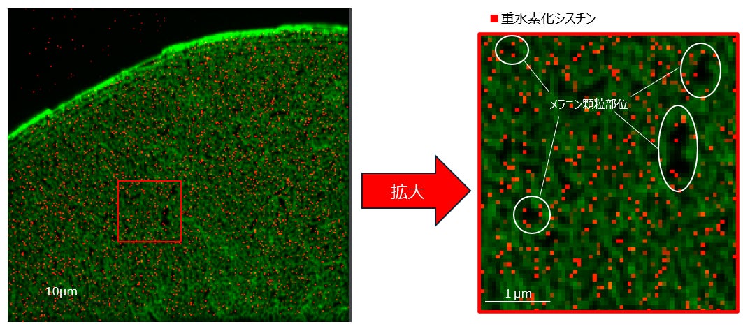 本研究では、シスチンをヘアカラー製剤に配合する技術を確立すると共に、その効果について検討を行いました。その結果、施術直前にシスチンを用時混合する技術を確立し、製剤への応用を可能にしました。また、その効果として、ツヤや透明感の向上および毛髪の疎水化を見出しました。これは、ヘアカラー製剤に配合したシスチンが毛髪内部に浸透し(図1)、メラニンやコルテックスの空洞を補修したためと考えられました(図2)。