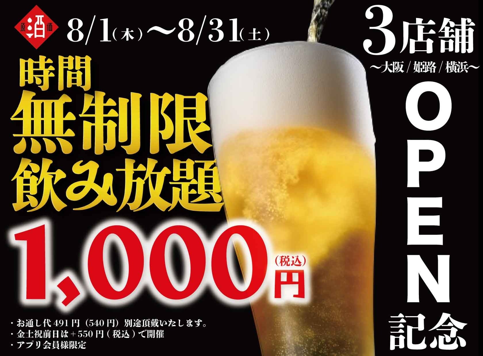 【3店舗OPEN記念】全店で時間無制限飲み放題が¥1000(税込)!
