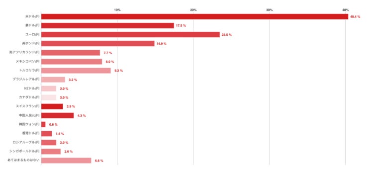 「米ドル/円」が40.4%で圧倒的な人気を集めた。ついで「ユーロ/円」が23.5%、「豪ドル/円」が17.5%となった。