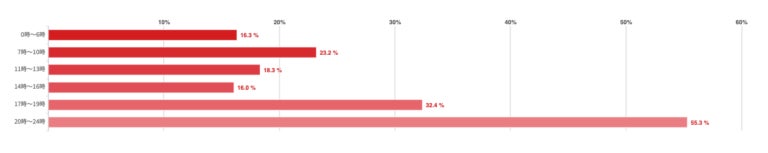 「20時〜24時」が55.3%で過半数を超え、圧倒的に多かった。なお、その他は「17時〜19時」が32.4%、「7時〜10時」が23.2%であった。