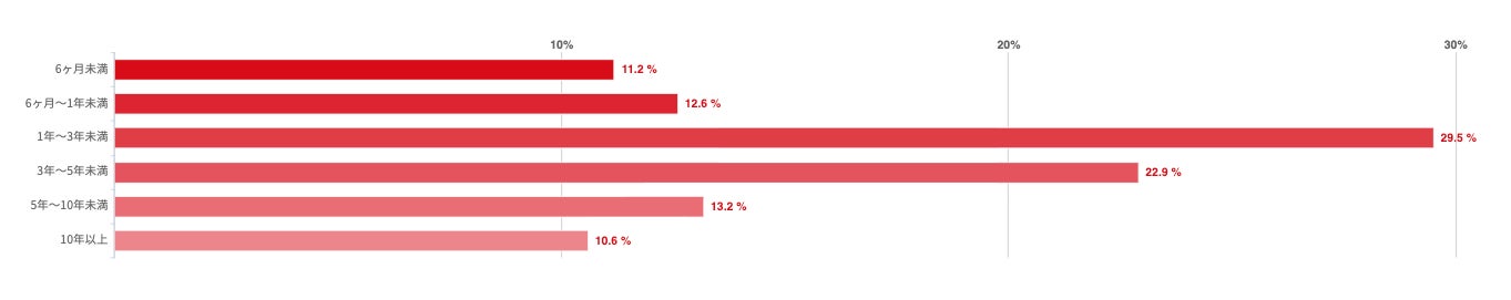 「1年〜3年未満」が29.5%で最も多く、「3年〜5年未満」が22.9%でこれに続いた。また、「5年〜10年未満」「6ヶ月〜1年未満」との回答も多かった。