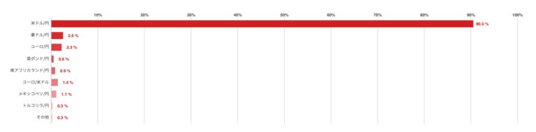 「米ドル/円」が90.3%で圧倒的な人気を集めた。ついで「ユーロ/円」が25.2%、「豪ドル/円」が13.2%となり、上位3つはいずれも円との組み合わせとなった。