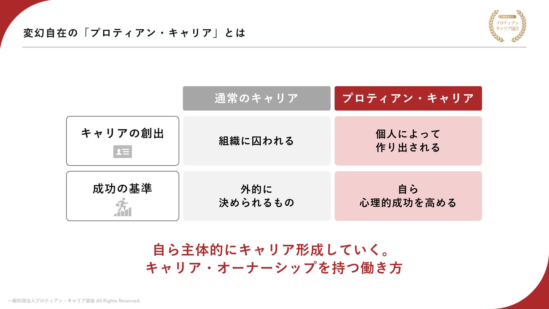 いままで(昭和・平成時代)のキャリアとこれから(令和時代)のキャリア、考え方は大きく変わり始めています。プロティアンのキーワードは、心理的成功、アイデンティティ×アダプタビリティ、関係性理論を重視しています。当協会は4年間で30万人以上に理論を伝えるなかで、この考え方が個人の可能性を拡げ、人的資本の最大化に寄与し、いきいき働く人を増やすものと確信を持っております。