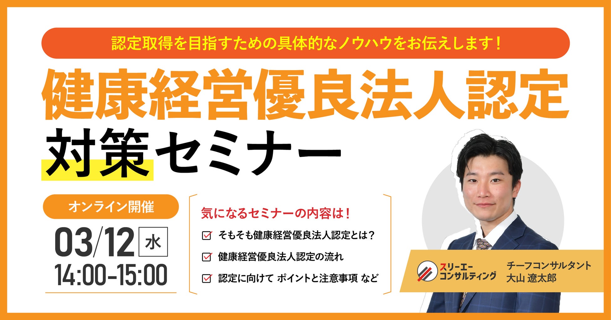 ISO・Pマーク⽀援実績数全国No.1※のISO/Pマークの取得・運⽤⽀援サービス「認証パートナー」を提供する株式会社スリーエーコンサルティング(本社:大阪府大阪市、代表取締役社長:竹嶋 寛人)は、3/12(水)14:00-15:00「健康経営優良法人認定対策無料オンラインセミナー」を開催します。「健康経営優良法人ってなに?」「認定取得の流れ、やるべきことが分からない…」という方へ向け、取得のメリットや取得の流れ、ポイントと注意事項などを健康経営のプロが分かりやすく解説いたします。