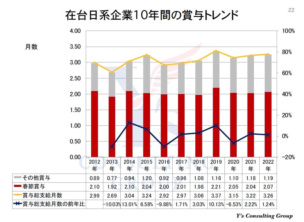 ワイズコンサルティング グループ(本社:中華民国台北市、代表取締役:吉本康志)のワイズリサーチの最新調査によると、在台日系企業の2022年年末賞与(いわゆる2023年の春節賞与)の平均支給月数は2.07ヶ月となる。